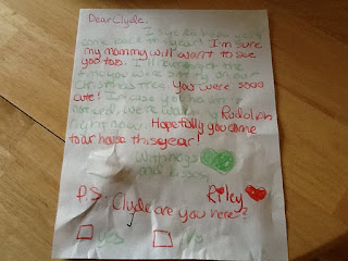 Once back in my room, I stashed the Tootsie Roll in a drawer, grabbed Clyde and headed out to the family room. The tree and other decorations aren't yet up, so I finally just placed him atop the birdhouse she made which sits on her craft table. Then back to her room to wake her. It did take several calls and nudges from me to rouse her, so I'm fairly certain she was oblivious to my earlier exploits. I walked back out to the kitchen to fix her breakfast and then heard her exclaim, "Mom! Clyde came - he's here!!"